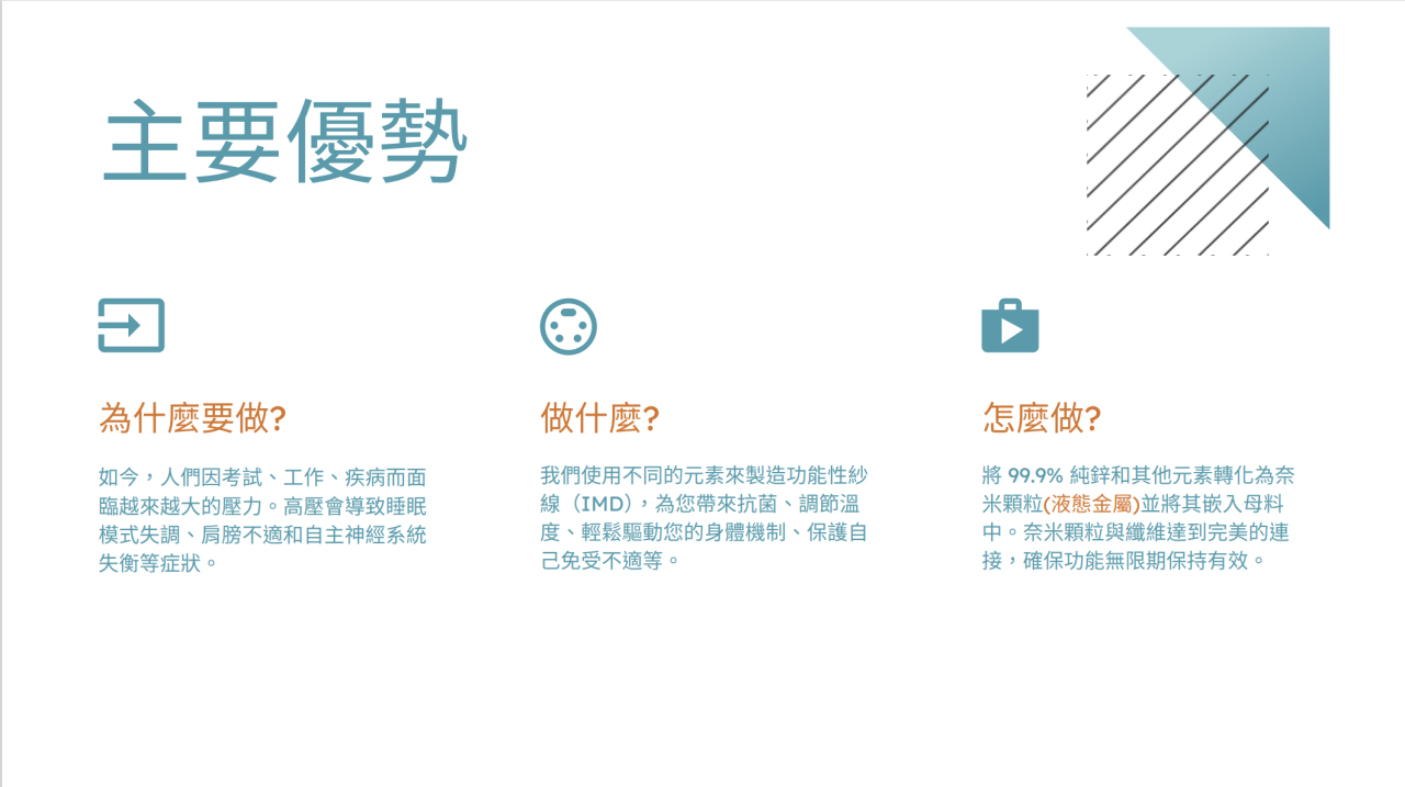 一針一線織成的面料成為含有微量元素的能量布,不僅有抗菌、除臭、抗紫外線、抗靜電、保暖、涼感、遠紅外線等功能,還可以激活生物體的能量達到釋壓、幫助循環、和睡眠。